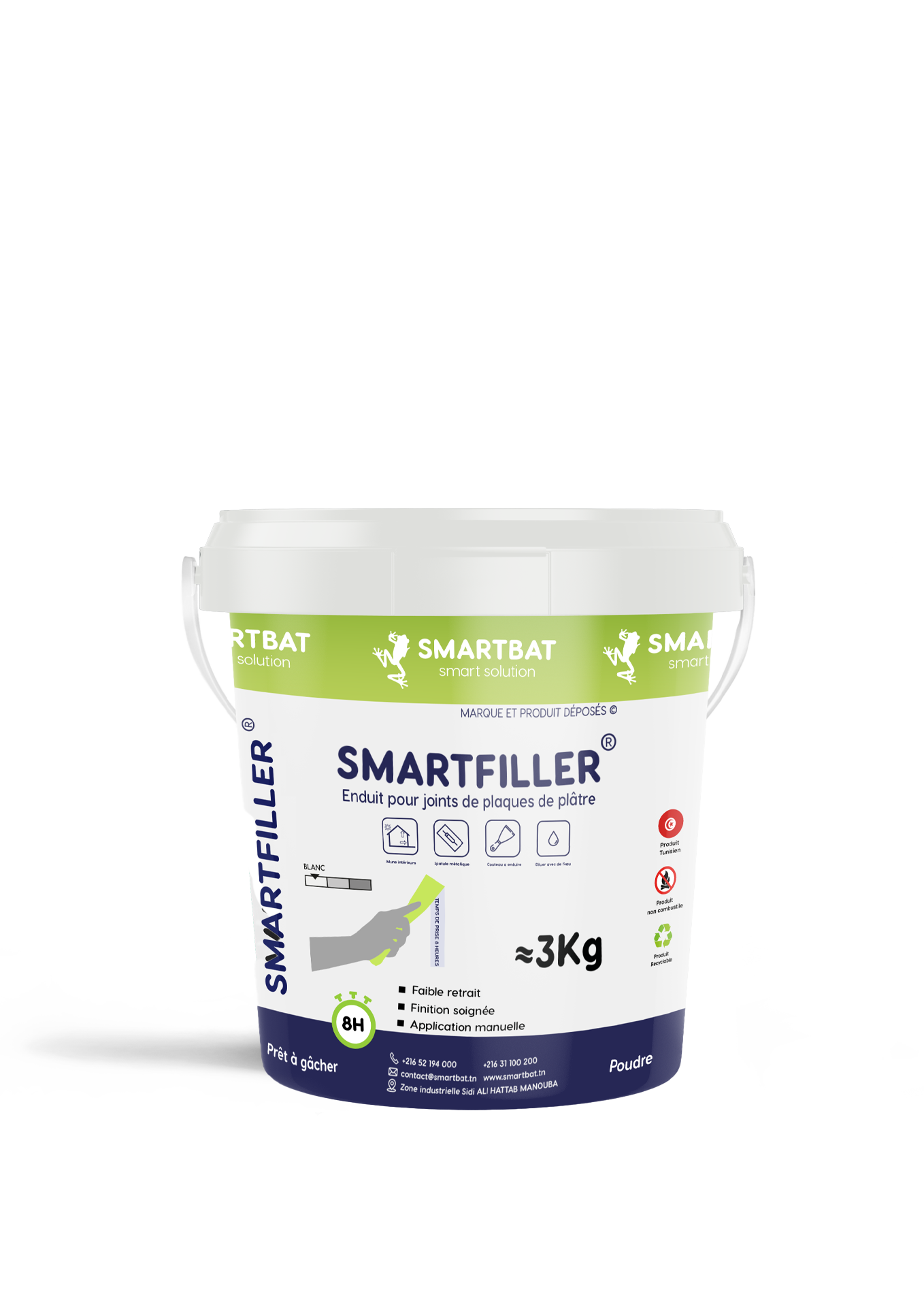 SMARTFILLER 8H est un enduit à joint de plaque de plâtre en poudre, à base de plâtre et de carbonate de calcium, permet le jointement entre deux plaques de plâtre à bord amincis à l’aide d’une bande à joint standard. SMARTFILLER 8H est un enduit prêt à gâcher, très facile à utiliser pour le traitement des joints et des angles des plaques de plâtre.