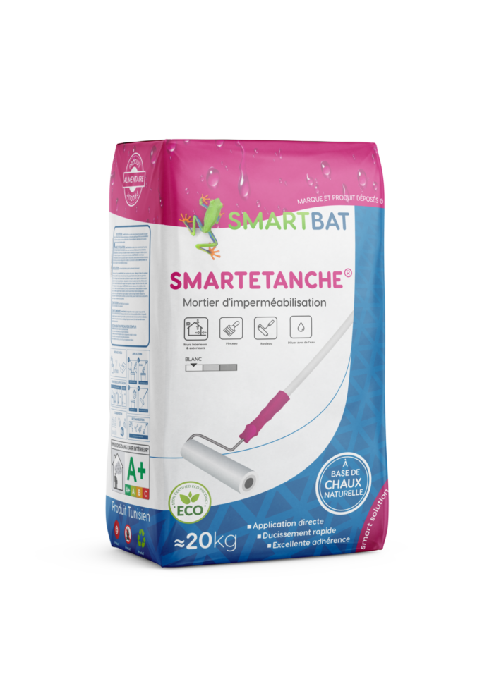 SMARTETANCHE est un mortier monocomposant en poudre, de couleur blanche, à base de chaux naturelle, de liants spéciaux, et d’adjuvants spécifiques, offrant une maniabilité et une adhérence optimal pour les travaux d’étanchéité, et d’imperméabilisation des toitures et des parois soumises à une poussé hydraulique élevée.
